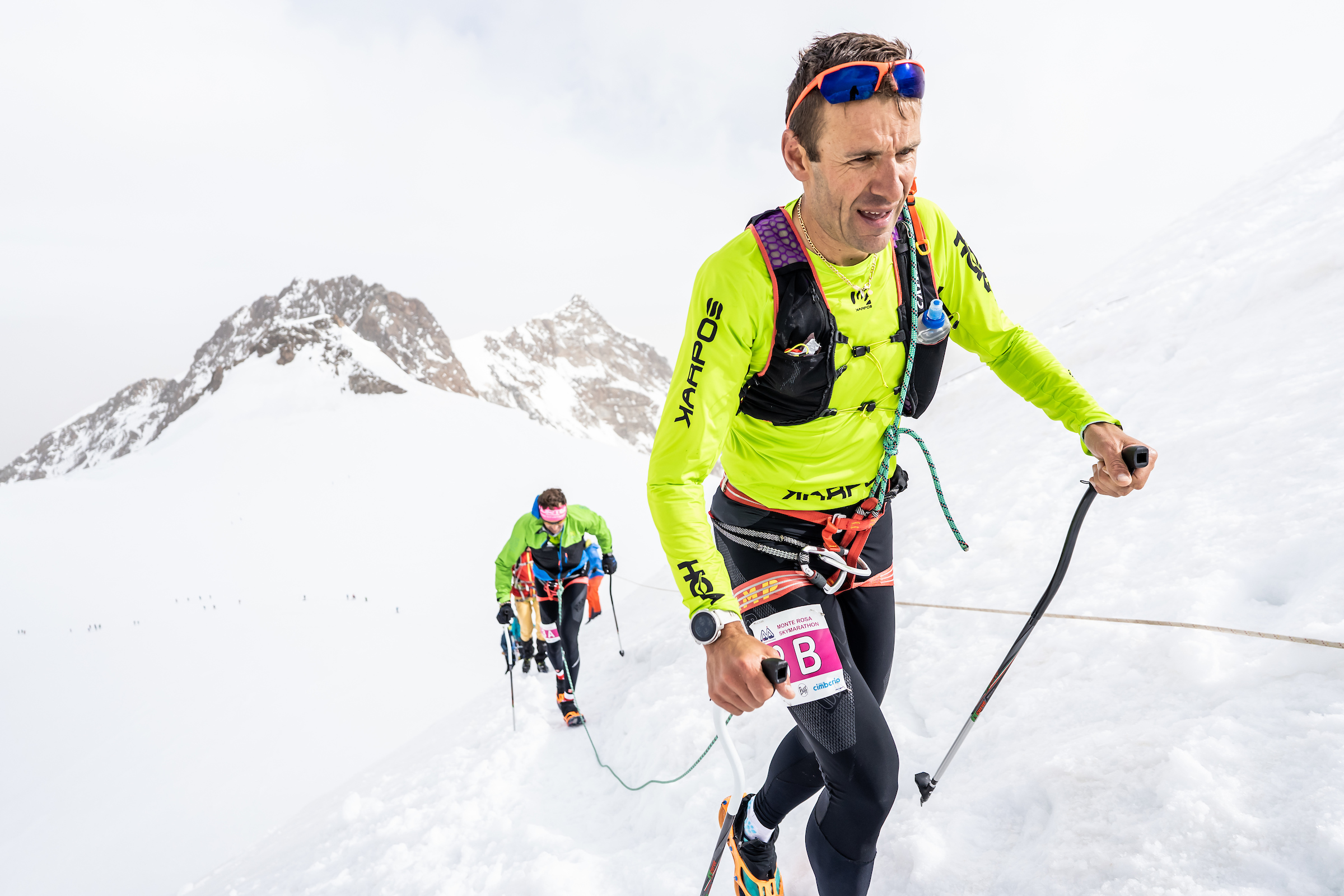 After a week of severe heat and zero temperatures even at 4,300m altitude, the snow was soft underfoot, adding to the challenge. To ensure the safety of the runners, apart from mountain guides, the alpine rescue service and expert volunteers, the runners must run in pairs, roped together, wearing micro crampons.